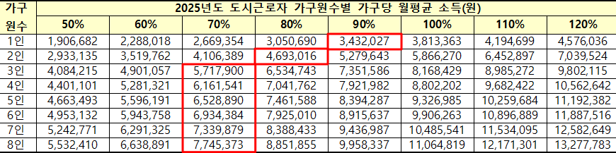 | 우대항목 : 가구원수 / 출산자녀수 | 적용 소득기준 | 금액 |