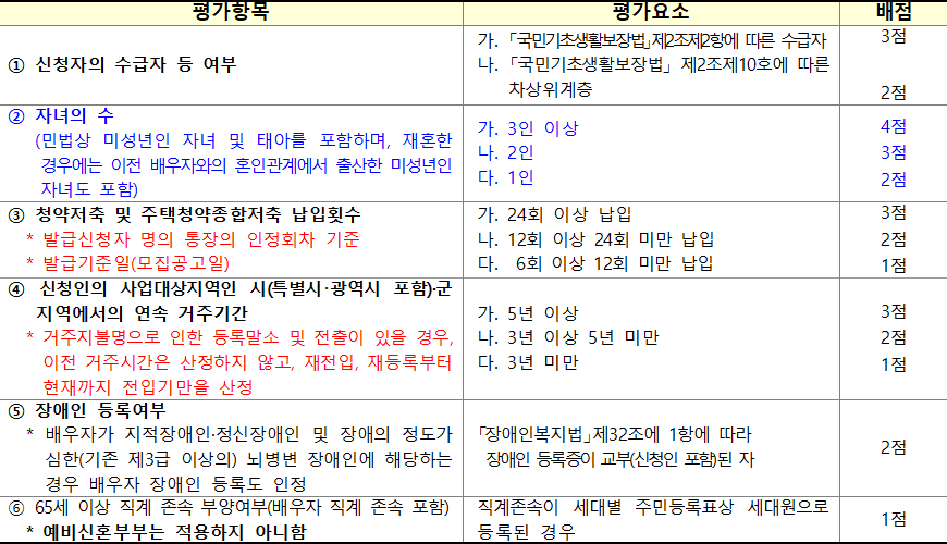 아래의 배점을 합산한 순위에 따라 입주대상자를 선정하되, 합산한 점수가 같을 경우 다음 각 항목의 순서에 따라 점수가 높은 순으로 입주자로 선정하며, 예비신혼부부의 경우에는 제6호의 배점을 합산하지 않음