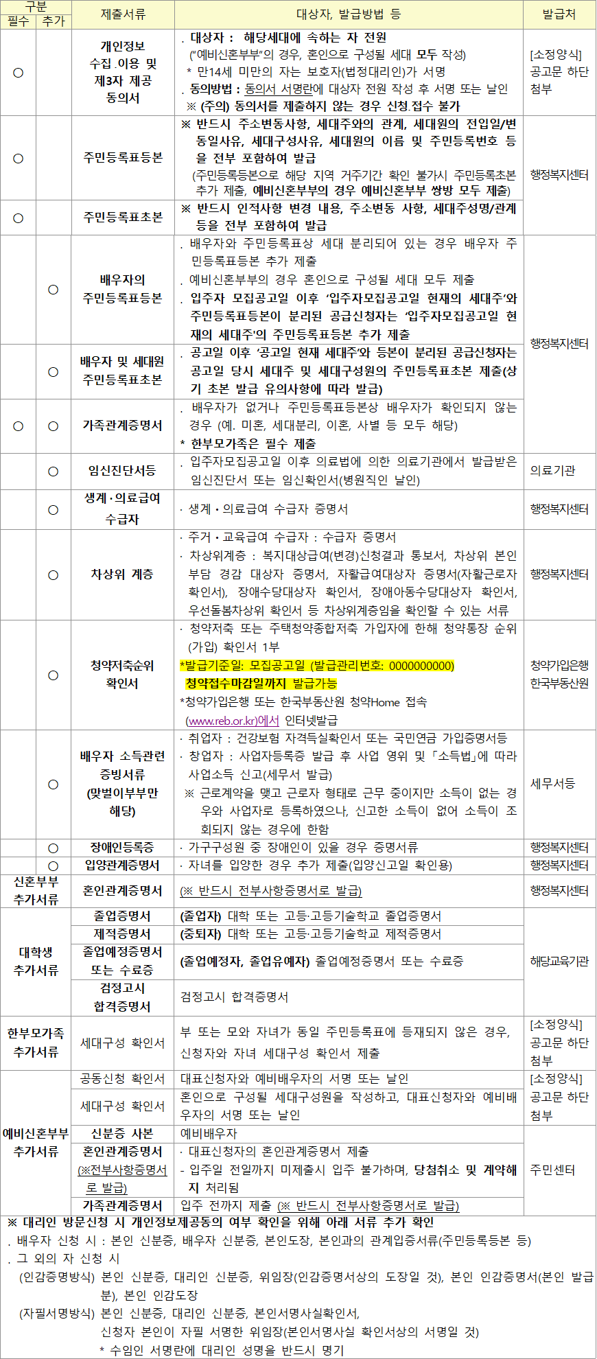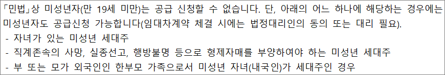| ※ 배우자가 국내 거주하지 않는 재외국민이거나 외국인 등록을 하지 않은 외국인인 경우 그와 혼인관계에 있는 국민의 공급 신청이 불가능합니다. |
